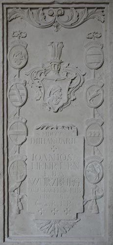 Diese Platte im Würzburger Domkreuzgang ist für den am 28.7.1722 in Mitwitz geborenen und am 3.1.1800 in Würzburg im Alter von 77 Jahren verstorbenen Freiherrn Johann Joseph Heinrich Ernst von Würtzburg. Mit noch nicht einmal 10 Jahren bekam er am 13.1.1732 die Tonsur, und im Alter von 14 Jahren immatrikulierte er sich am 25.11.1736 an der Universität Würzburg. Er wurde am 15.10.1736 in St. Burkard Domizellar, war 1732-1800 Domherr in Würzburg (er hatte am 1.2.1732 die Präbende des verstorbenen Bruders Franz Karl Joseph Wilhelm von Würtzburg bekommen und wurde am 31.5.1760 Mitglied des Domkapitels) und 1747-1800 Domherr in Bamberg. In der Diözese Bamberg hatte er mehr und höhere Positionen im Klerus inne als in Würzburg, denn er war Oberpfarrer von Unserer Lieben Frau in Bamberg, von Buttenheim und von Königsfeld, 1773/74 war er Rektor der Universität Bamberg, er war im Fürstbistum Bamberg Generalvikar (Vicarius in Spiritualibus Generalis) und wurde ebenfalls 1765 Präsident des Geistlichen Rates in Bamberg. Die Niederen Weihen bekam er am 4.4.1755, die Subdiakonsweihe wenige Tage später am 9.4.1755, und 1766 wurde er in Bamberg zum Priester geweiht. Am 18.12.1779 resignierte er in St. Burkard.