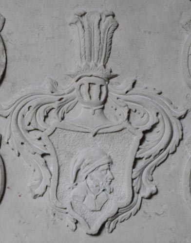 Das zentrale Vollwappen ist das der Freiherren von Würtzburg, in Gold das Brustbild eines bärtigen Mannes, hier linksgewendet, schwarz gewandet mit silbernem Kragenaufschlag, auf dem Kopf eine spitze, nach hinten umgebogene schwarze Mütze mit silbernem Aufschlag, an der Spitze ein roter sechszackiger Stern, auf dem gekrönten Helm mit schwarz-goldenen Decken ein Stoß Pfauenfedern, außen je zwei besonders tingierte umgebogene Straußenfedern, rechts golden und schwarz, links schwarz und golden, wobei hier die Federn darstellerisch nicht gut voneinander differenziert sind (Siebmacher Band: ThüA Seite: 92 Tafel: 73, Band: SchwA Seite: 36 Tafel: 25).