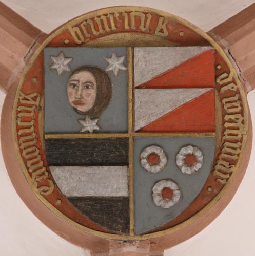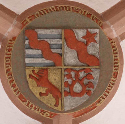 Südflügel, zwölfter Schlußstein von Westen: Der am 5.12.1437 in Würzburg verstorbene Dieter von Erbach war nicht nur seit 1413 in Würzburg, sondern auch seit 1420 in Mainz Domherr. Die umlaufende Inschrift lautet: "diether(us) schenk d(omi)n(u)s de erpach Canonicus." Die vier Felder des gevierten Schildes stehen für seine Ahnen: Dieter von Erbach war der Sohn von Eberhard X. von Erbach (-1418) und Maria von Bickenbach (-1397). Sein Bruder war der spätere Mainzer Fürstbischof Dietrich von Erbach. Sein Großvater väterlicherseits war Heinrich I. von Erbach (-16.2.1387), seine Großmutter väterlicherseits war Anna von Erbach-Erbach (-29.11.1375), sein Großvater mütterlicherseits war Dietrich von Bickenbach (-24.8.1403) und seine Großmutter mütterlicherseits war Agnes von Isenburg. Entsprechend sehen wir hier zweimal ein rot-silbern geteiltes Erbach-Feld mit drei (2:1) Sternen in verwechselten Farben, ein Bickenbach-Feld mit zwei schrägrechts gestellten Reihen silberner (nicht goldener wie hier) Rauten auf rotem Grund und ein Isenburg-Feld mit zwei roten Balken auf silbernem Grund (in dieser Tinktur wäre das Niederisenburg, Dietrichs Großmutter Agnes entstammte aber dem Gerlachschen Stamm und müßte daher schwarze Balken führen).