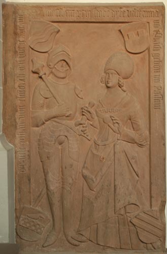 Die Inschrift ist sehr unvollständig, aber nur an einer Stelle optisch links oben beschädigt; für die Frau existiert immerhin das Jahr ihres Ablebens, aber nicht das genaue Datum, und für den Ehemann haben wir gar keine Daten, vermutlich wurden sie später einfach nicht mehr nachgetragen, als er seiner Frau folgte. Jedenfalls lebte der Ehemann länger als seine Frau, denn im Jahr 1512 hatte er noch das Lorcher Schultheißenamt inne. Sehr schön ist die Darstellung der beiden Eheleute, die sich einander zuwenden. Der Mann in seiner Rüstung mit Schaller und hochgeklapptem Visier, mit geschulterter Streitkeule (Morgenstern) in der Rechten und mit der Linken am Griff des großen Zweihänderschwertes, steht etwas steif, während seine Ehefrau sich ihm in lebhafter Geste mit wie abwehrend erhobenen Händen zuwendet und zudem ihren rechten Fuß auf seinen linken stellt, eine bemerkenswerte und seltene Pose, als wolle sie ihn mit allen Mitteln zurückhalten. Eine große, ovale Haube bedeckt ihren Kopf, und unter dieser quellen seitlich die von kreuzförmig geflochtenen Bändern zusammengehaltenen Haare hervor.