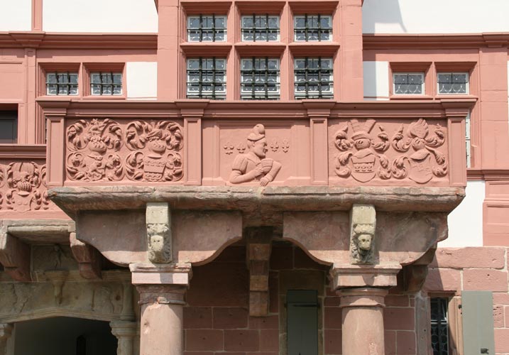 Das schönste Bauteil an der rheinseitigen Monumentalfassade ist der Erker mit dem auf zwei mächtigen toskanischen Steinsäulen ruhenden Balkon im ersten Stock, der um den kräftig hervortretenden, zweistöckigen Erker herumläuft und mit seiner wappengeschmückten Brüstung der Stolz seiner Bewohner war. Einst lief die Balkonbrüstung die ganze Rheinfront entlang, sie wurde aber, wie durch das Fehlen einer Rand-Platte und mangelnde Paßform einer anderen Platte deutlich wird, nachträglich verkürzt. Lange Zeit waren die verwitterten Platten des baufälligen Balkons abgenommen. Anfang der 1990er Jahre sollten sie in einer Steinmetzwerkstatt aufgearbeitet werden, und es wurden auch Kopien gemacht. Alles zusammen lagerte 15 Jahre lang in einem Lager der Bäckerei Laquai. Später stellte sich heraus, daß die zum Zwecke der Wiederanbringung angefertigten Kopien nicht wetterfest waren. Für rund 20 000 Euro wurden neue Kopien angefertigt, und die sind jetzt nach der Restaurierung 2010 ff. am ursprünglichen Ort angebracht.