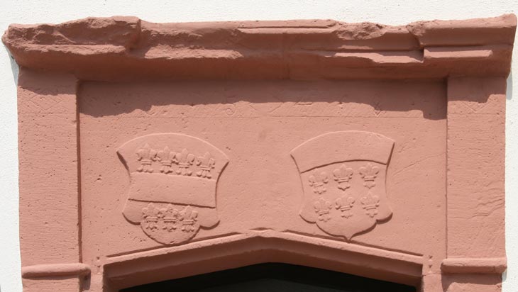 Abb.: Süd-Brüstung des schmalen Balkonteiles über dem Eingang, linker Teil mit zwei von vier Wappen. Optisch links ist das Wappen der Kolbe von Wilnsdorff (Willensdorf), es ist schwarz-silbern geteilt und viermal gespalten, als Helmzier zu schwarz-silbernen Decken ein Paar schwarz-silbern gevierte Büffelhörner (nach Zobel Tafel 371, vgl. die v. Wilnsdorf auch im Siebmacher Band: NaA Seite: 42 Tafel: 70 mit einem wie der Schild bez. Schirmbrett als früheres Motiv, später wurden die Büffelhörner verwendet). Daneben ist das Wappen der von Rheinberg, in Silber ein roter Balken (nur die untere Teilungslinie ist erhalten), auf dem Helm mit rot-silbernen Decken ein silbernes Paar Büffelhörner, jeweils belegt mit einem roten Balken. Das Wappen wird beschrieben im Gruber und bei Zobel auf Tafel 273.