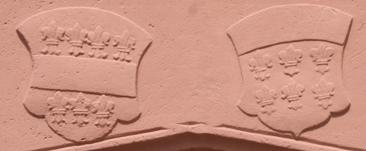Abb.: Süd-Brüstung des breiten Hauptbalkons, mittlerer Abschnitt mit der Portraitdarstellung zwischen zwei Lilienpaaren. Diese Darstellung trennt die Wappenreliefs in einen Bereich in Bezug auf Maria Hilchen von Lorch (1510-5.10.1561) väterlicher Ahnen links davon und einen Bereich mütterlicher Ahnen rechts davon.