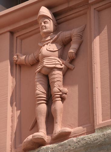 Abb.: Ost-Brüstung des breiten Hauptbalkons, linker Abschnitt mit zwei von vier Wappen. Optisch links ist das Wappen der von Wachenheim, zweimal geteilt von Gold, Rot und Silber, oben im goldenen Platz drei schwarze Vögel nebeneinander, auf dem Helm mit gänzlich rot-silbernen oder rechts rot-goldenen und links rot-silbernen Decken ein zweimal von Gold, Rot und Silber geteilter Flug. Das Wappen wird beschrieben im Gruber, bei Wolfert und bei Zobel Tafel 350. Daneben ist das Wappen der von Löwenstein, in Schwarz ein silberner, gekrönter Löwe, auf dem Helm mit schwarz-silbernen Decken der Löwe sitzend. Das mit den unterschiedlichsten Beizeichen und Kleinoden vorkommende Wappen wird beschrieben bei Zobel Tafel 210-211, bei Gruber und im Siebmacher Band: NaA Seite: 30 Tafel: 47.