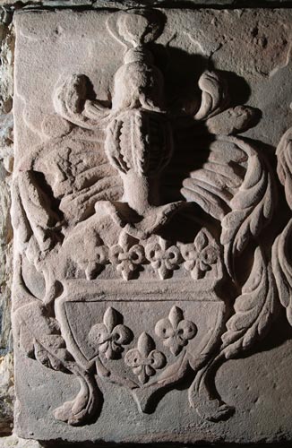 Dieses Paar Wappenschilde (Abb. oben, Detailausschnitt unten) befindet sich am Treppenturm der Westseite am auf die Hochterrasse führenden Ausgang, auf 1548 datiert, also noch zu Lebzeiten des Feldmarschalls. Die beiden Schilde zeigen die bereits zuvor beschriebenen Wappen der Hilchen von Lorch und der von Rüdesheim. Sie stehen für Johann III. Hilchen von Lorch (15.4.1484-15.4.1548), unter dem der Bau begonnen wurde, und seine damals längst verstorbene Frau, Dorothea von Rüdesheim (1485-1512).