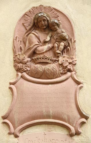 Dieser Wappenstein zeigt zwei von einem Engel gehaltene Wappenschilde, die für zwei aufeinanderfolgende Mainzer Fürstbischöfe stehen. Unter den Schilden sind die Jahreszahlen 1504 und 1505 eingeschlagen. Der optisch linke Schild steht für Fürstbischof Berthold von Henneberg (reg. 1484-1504) und ist geviert, Feld 1 und 4: in Rot ein sechsspeichiges, silbernes Rad, Erzstift Mainz, Feld 2: in Rot eine goldgekrönte silberne Säule ("Wahlverwandtschaft" Colonna), Feld 3 (hier zerstört): in Gold auf grünem Dreiberg eine schwarze Henne mit rotem Kamm und ebensolchem Kehllappen, gefürstete Grafschaft Henneberg. Der optisch rechte Schild steht für Fürstbischof Jakob von Liebenstein (reg. 1504-1508), Bertholds Nachfolger. Sein Wappenschild ist geviert, Feld 1 und 4: in Rot ein silbernes, sechsspeichiges Rad, Erzstift Mainz, Feld 2 und 3: von Silber und Schwarz dreimal geteilt, Stammwappen der von Liebenstein.