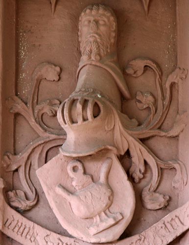 Ausschnittsvergrößerung mit den Schilden für die Mainzer Fürstbischöfe Berthold von Henneberg und Jakob von Liebenstein. Dem 1504 erfolgten Regierungswechsel auf dem Mainzer Bischofsstuhl, der genau in die Bauzeit fiel, verdanken wir das Vorhandensein zweier Wappen, dem des Beginners und dem des Vollenders. Die Erhaltung des Henneberg-Wappens ist deutlich besser als beim zuvor beschriebenen Stein.