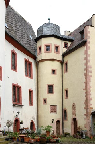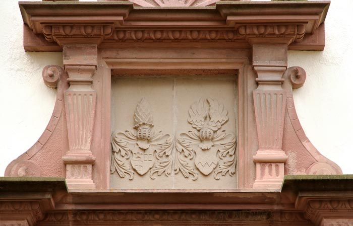Abb. rechts: Blick auf die hofseitige Front des Palas, am Renaissance-Prunkportal befindet sich das zuvor beschriebene Allianzwappen Cronberg / Brendel von Homburg, am Gebäudeteil ganz links (Kapellenturm) in Höhe des ersten Obergeschosses das weiter oben beschriebene Wappen des Mainzer Fürstbischofs Konrad III. von Dhaun.