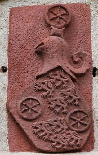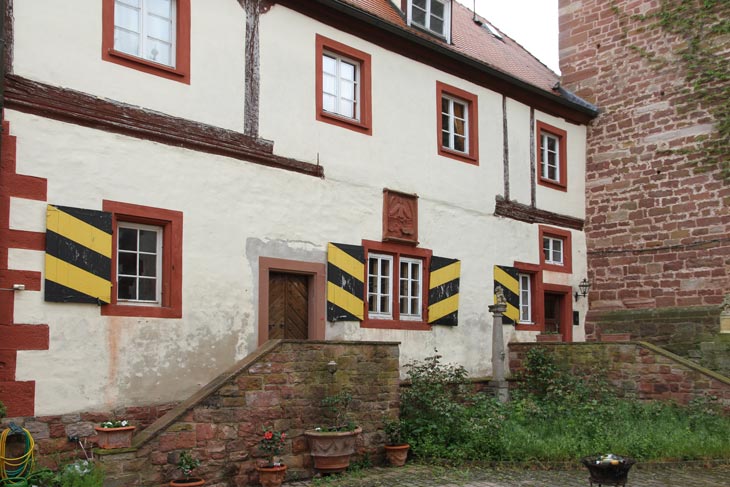 Im Burghof, der nach Durchschreiten der Tore und Passieren des Bergfriedes erreicht wird, begegnen dem Besucher weitere, ältere Wappensteine. Wie beim kurzen geschichtlichen Abriß geschrieben, wird die Geschichte dieser Burg geprägt von der strategisch wichtigen Grenzlage zwischen zwei geistlichen Fürstentümern, Mainz und Würzburg. Die folgenden Wappensteine zeugen von der Herrschaft und der Bauherrentätigkeit der Mainzer Fürstbischöfe, die diesen wichtigen Posten zur Wahrung ihrer Territorialinteressen ausbauten.