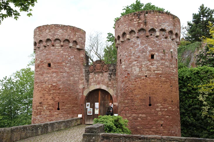 Außerhalb des Mauerberings, noch diesseits des Halsgrabens führt ein barockes Tor auf die Gartenanlagen auf den Außenwällen. Das elegante und kunstvolle Tor, das mit den rohen Verteidigungsmauern effektvoll kontrastiert, mit einer grotesken Maske auf dem Schlußstein, trägt einen gesprengten Dreiecksgiebel, in dessen Öffnung ein Aufsatz mit einem weiteren, sich in die Flucht der Linien einpassenden Dreiecksgiebel, dessen Horizontalgebälk von einer auf dem Aufsatz angebrachten Wappenkartusche durchbrochen wird, welche das Wappen der Kämmerer von Worms gen. von Dalberg trägt. Deren Wappen ist geviert, Feld 1 und 4: unter einem mit drei Spitzen abgeteilten goldenen Schildhaupt in Blau 6 (3:2:1) silberne Lilien (Kämmerer von Worms), Feld 2 und 3: in Gold ein schwarzes Ankerkreuz (Dalberg). Die Kartusche wird von einem perlenbesetzten Kronreif überhöht.