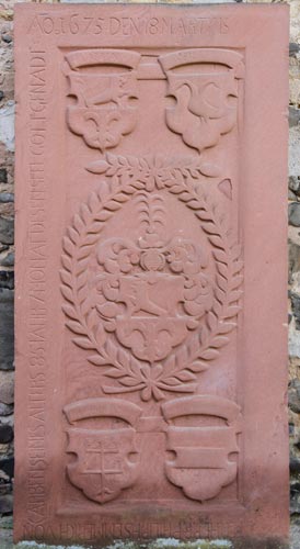 Die Inschrift dieser Grabplatte ist in den entscheidenden Partien nicht zu entziffern. Das zentrale Vollwappen zeigt einen Steinbock, auf dem Helm derselbe wachsend. Dieses Wappenbild wiederholt sich zweimal in der aus vier Schilden bestehenden Ahnenprobe, ergänzt durch zwei identische Schilde, die unter einem Schildhaupt mit zwei sechszackigen Sternen nebeneinander gespalten sind (vermutlich von Dorfelden, s. o.). Hinweise willkommen.