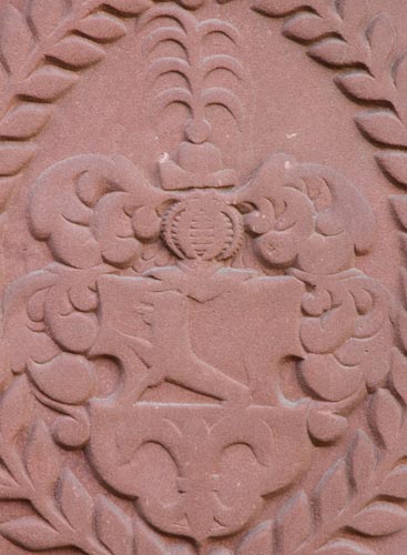 Grabplatte für Franz Emmerich Lothar Burkhard Adolf von Carben, der als letztes männliches Mitglied im Jahre 1729 verstarb, weshalb sein Wappen zum Zeichen des Erlöschens des Geschlechtes gestürzt ist. Sein Wappen ist geteilt, oben in Gold ein wachsender roter Löwe, unten in Blau eine silberne Lilie (Aschaffenburger Wappenbuch Tafel 37 Seite 88, 52, Siebmacher Band: NaA Seite: 19 Tafel: 26, Zobel Tafel 62). Der Verstorbene war der Sohn von Emmerich Adolph von Carben zu Staden (1653-16.1.1702), vermählt 1693 mit Maria Cunigunda Leyser von Lammsheim (Lambsheim), Tochter von Johann Leyser von Lammsheim und Maria Catharina von der Hauben. Über des Verstorbenen Neffen, Frobenius Ferdinand Josef Freiherr von Wetzel, wurde die Erinnerung an die Familie fortgeführt. Er war der Sohn von Anna Maria Elisabetha von Carben zu Staden (1695-) und Lotharius Franz Joseph Freiherr von Wetzel, und er erhielt 1775 die kaiserliche Genehmigung, die beiden Namen und Wappen zu vereinen, seitdem hieß er von Wetzel, genannt von Carben.