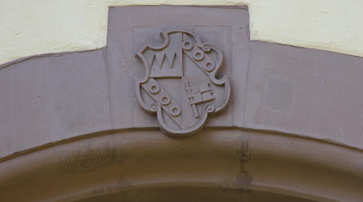 Eine Wappenkartusche gleichen Inhalts befindet sich auf der rustizierten Rahmung des Torbogens mit einer mehrfachen Reihe sehr plastisch hervortretender Kissenquader, auf einem farblich abgesetzten Schlußstein. Das Wappen des Würzburger Fürstbischofs Julius Echter von Mespelbrunn (reg. 1573-1617) ist in beiden Fällen geviert: Feld 1: "Fränkischer Rechen" = von Rot und Silber (hier in beiden Fällen leider falsch angemalt mit umgekehrten Farben! Das Rot gehört oben hin, das Silber unten hin, an der Pfarrkirche ist es hingegen korrekt) mit drei aufsteigenden Spitzen geteilt, Herzogtum zu Franken, Feld 2 und 3: in Blau ein silberner Schrägbalken, belegt mit drei blauen Ringen, Stammwappen der Echter von Mespelbrunn, Feld 4: "Rennfähnlein" = in Blau eine rot-silbern gevierte, an den beiden senkrechten Seiten je zweimal eingekerbte, schräggestellte Standarte mit goldenem Schaft, Hochstift Würzburg.