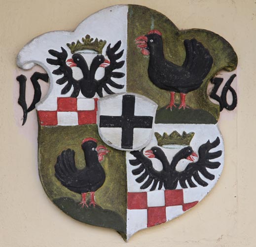 Als Spolie eingemauert in der Außenwand des Gemeindezentrums, oben links im Bild unter dem Vordach neben der modernen Tür, befindet sich das Wappen (Abb. unten) des Fuldaer Fürstabtes Johann III. Graf von Henneberg-Schleusingen (30.4.1503-20.5.1541, regierte 1529-1541), Sohn von Wilhelm VI. von Henneberg-Schleusingen, Graf und Herr zu Mainberg (29.1.1478-24.1.1559) und Markgräfin Anastasia von Brandenburg (17.3.1478-4.7.1534). Es ist geviert mit Herzschild: Feld 1 und 4: Alt-Henneberg, geteilt, oben in Gold (hier falsch silbern angestrichen) ein wachsender schwarzer Doppeladler, darüber schwebend eine goldene Krone, unten rot-silbern in zwei Reihen geschacht, Feld 2 und 3: in Gold auf grünem Dreiberg eine schwarze Henne mit rotem Kamm und ebensolchem Kehllappen, redendes Wappen der gefürsteten Grafen von Henneberg, Neu-Henneberg, Herzschild: in Silber ein schwarzes durchgehendes Kreuz, Fürstabtei Fulda. Das hier auf 1536 datierte Wappen wird ohne Oberwappen und ohne Prunkstücke dargestellt. Eine bessere Darstellung befindet sich am Hammelburger Rathaus. Johann III. Graf von Henneberg-Schleusingen war in mehreren Domstiften als Kleriker vertreten, 1515-1538 war er Kanoniker in Straßburg, 1517-1541 Domherr in Mainz, 1518 Domherr zu Köln und 1519-1523 Domherr in Bamberg. Seine große Karriere machte er jedoch in Fulda, wo er bereits ab 1521 die Geschicke der Fürstabtei leitete, denn schon mit 18 Jahren war er auf dem Reichstag zu Worms vom Kaiser zum regierenden Koadjutor des Abtes Hartmann von Kirchberg bestellt worden. Als sein Vorgänger starb, war die Wahl zum Nachfolger eine Formsache, denn Hartmann II. von Kirchberg wußte die Abtei in guten Händen und hatte sich ohne weiteres Interesse nach Mainz zurückgezogen und die Geschäfte seinem Koadjutor überlassen. De facto leitete also Johann III. Graf von Henneberg-Schleusingen die Fürstabtei schon 1521. Er starb jung, mit 38 Jahren. Seine Amtszeit war geprägt von Reformation und Bauernkrieg, und er mußte die Fürstabtei zwischen aufständischen Bauern und hessischen Besatzungstruppen irgendwie hindurchmanövrieren.