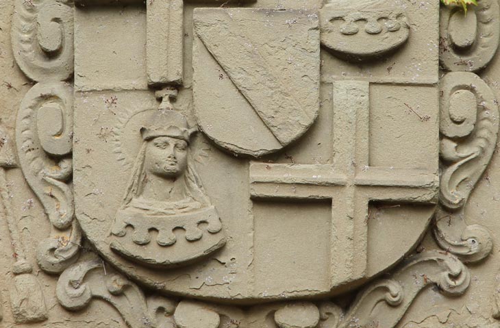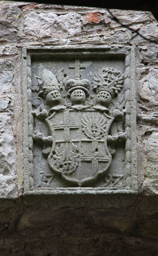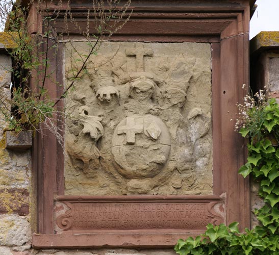 Abb. rechts: Der oben beschriebene Wappenstein des Fuldaer Fürstabtes Balthasar von Dernbach im baulichen Kontext. Dieser Wappenstein datiert noch vor den Zerstörungen des Dreißigjährigen Krieges und wurde nach dem Wiederaufbau erneut eingemauert.