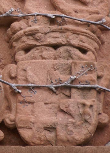 Ganz anders das andere Wappen optisch rechts: Wir sehen zwar auch ein Kreuz, doch nicht an der Ehrenposition, es ist nicht das Fuldaer Kreuz. Und ebenso fehlen die Insignien eines Abtes. Dennoch stehen beide Schilde quasi auf einer Ebene in gleicher Wichtigkeit nebeneinander, und dies ist Ausdruck einer seltsamen Konstellation, denn der Bauherr, Johann Salentin von Sintzig, Domdekan in Magdeburg, wäre beinahe Abt des Stifts Fulda geworden, da er eigentlich Koadjutor des vorherigen Abtes Hermann Georg von Neuhof/Neuhoff genannt Ley (regierte 1635-1644) war, was ihn eigentlich für die Nachfolge hinreichend empfohlen und vorgezeichnet hätte, und es hätte üblichem Procedere entsprochen, den bisherigen Koadjutor bei einer Neuwahl des Abtes zu berücksichtigen. Doch - Pech gehabt, das Stiftskapitel wählte einen anderen!