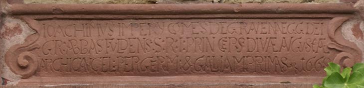 Die in die Partie aus haltbarerem rotem Sandstein gehauene Inschrift, die unter dem zerbröselnden Wappen aus honigfarbenem Sandstein zu lesen ist, lautet: "IOACHIMVS IMPERII COMES DE GRAVENEGG DEI GR(ATIA) ABBAS FVLDENSIS S(ACRI) R(OMANI) I(MPERII) PRINCEPS DIVAE AUGVSTAE ARCHICANCEL(LARIUS) PER GERM(ANIAM) ET GALLIAM PRIMAS 1668" - Joachim Reichsgraf von Gravenegg, von Gottes Gnaden Abt von Fulda, des Heiligen Römischen Reiches Fürst, Erzkanzler der Kaiserin, Benediktiner-Primas für Germanien und Gallien.