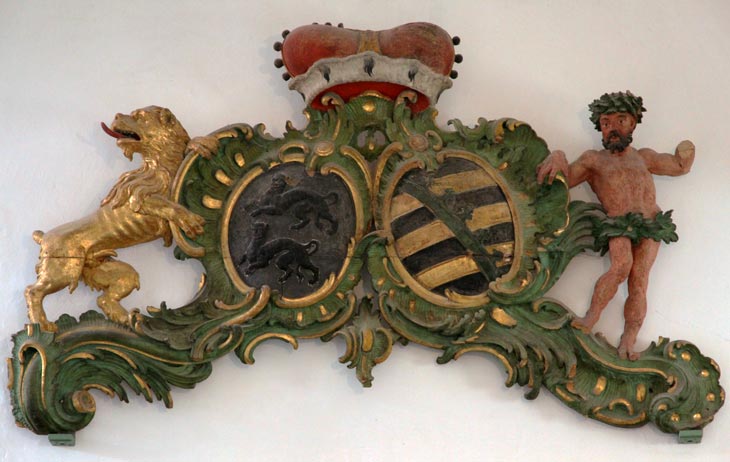 Das oben abgebildete, aus Holz geschnitzte und bemalte Wappen befindet sich ebenfalls im Korridor des ersten Obergeschosses. Es handelt sich um das Wappen der Grafen von Nassau-Saarbrücken. Die Farben und einige Details entsprechen nicht einer korrekten Wiedergabe. Der Hauptschild ist einmal gespalten und zweimal geteilt mit einem oben eingeschobenen Feld und belegt mit einem Herzschild. Im einzelnen können die Felder wie folgt unter Richtigstellung der Tinkturen zugeordnet werden: Feld 1: Grafschaft Saarbrücken, in blauem, mit silbernen, fußgespitzten Kreuzchen (Steckkreuzchen, können auch widergekreuzt sein) bestreutem Feld ein silberner, gekrönter Löwe, Feld 2: Grafschaft Saarwerden, in Schwarz ein silberner, rot bewehrter Doppeladler, Feld 3: Grafschaft Moers, in Gold ein schwarzer Balken, Feld 4: Grafschaft Weilnau, in Gold zwei rote, blau bewehrte Leoparden (hersehende, schreitende Löwen) übereinander, Feld 5: Herrschaft Merenberg, in Grün ein goldener Schragen, bewinkelt von 12 (4 x 3) goldenen Kreuzchen, Feld 6: Geroldseck-Lahr, in Gold ein roter Balken, Feld 7: Lahr-Mahlberg, in Gold ein schwarzer, gekrönter Löwe, Herzschild: Grafschaft Nassau, in blauem und mit goldenen aufrechten Schindeln bestreuten Feld ein goldener Löwe, rot gezungt, rot bewehrt und auch golden gekrönt. Korrekte Tinkturen weisen nur die Felder 3, 4, 6 und 7 auf, gänzlich abwegig gestaltet ist Feld 5. Dieses Wappen der Grafen von Nassau-Saarbrücken hat die Form, wie sie ab 1660 und bis 1805 von den Linien des Walramschen Stammes geführt wurde. Ein Vergleichswappen befindet sich in der Hofstube, in dem betreffenden Kapitel werden auch die ehelichen Verbindungen erläutert.