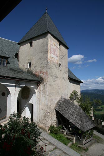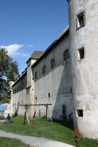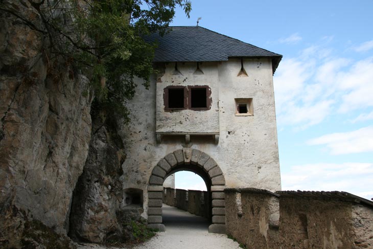 Die Burg Hochosterwitz wurde im wesentlichen unter Christoph Khevenhüller und seinem Neffen Georg III. Khevenhüller zu der aufwendig gesicherten Anlage, die wir heute sehen. Insbesondere Georg Khevenhüller war eine der wichtigsten politischen Personen seiner Zeit, als Obriststallmeister, Rat dreier Kaiser, Geheimer Rat, Sekretär, Oberstkämmerer und Obersthofmeister des Erzherzogs Karl eine der einflußreichsten Personen Österreichs. Und das alles, obwohl Georg Protestant war. Nach seinem Tod mußten schon die Kinder das Auseinanderdriften der Konfessionen erleben. Sein Sohn Franz schon konnte nicht mehr in der mittlerweile katholisch gewordenen Villacher Pfarrkirche neben seinem Vater beigesetzt werden, er fand seine letzte Ruhestätte in der Kirche von Hochosterwitz. Doch das war noch harmlos gegen das, was Georgs Enkeln blühte: Ferdinand II. ließ der Gegenreformation freien Lauf, und am 1.8.1628 führte das Generalmandat Ferdinands II. zur Ausweisung protestantischer Ritter aus der Steiermark, aus Kärnten und aus Krain. Auch Georgs Enkel Sigmund und Paul wählten die Auswanderung. Ein Teil der Familie, nämlich Franz und Bartholomäus, Brüder Sigmunds VI., wandte sich 1628 wieder dem katholischen Glauben zu. Dadurch konnte Hochosterwitz für die Familie gerettet werden, während Wernberg und Landskron an den Landesherrn fielen. Die originellen Verteidigungseinrichtungen mußten sich nie bewähren, weil Hochosterwitz nach seinem Ausbau keine einzige Belagerung mehr durchzustehen hatte. Der Ort der Vorfahren wurde von der Familie instand gehalten, war aber wegen der Verschiebung des Lebensschwerpunktes nicht mehr Residenz. Paradoxerweise verdanken wir auch diesem Umstand die erstaunlich gute Bewahrung des geschlossenen Gesamteindrucks aus dem ausgehenden 16. Jh. ohne störende nachträgliche Veränderungen, wenn man vom ca. 1673 erfolgten Zubau des Balkontraktes einmal absieht. Und für aufstiegsunfähige und -unwillige Touristen wurde im 20. Jh. ein Aufzug an die Felswand angebaut. Die jüngste Baumaßnahme ist nach einem Felssturz ein 2013 in Blockbauweise errichteter, gedeckter Schutzgang zwischen dem 2. und dem 3. Tor.