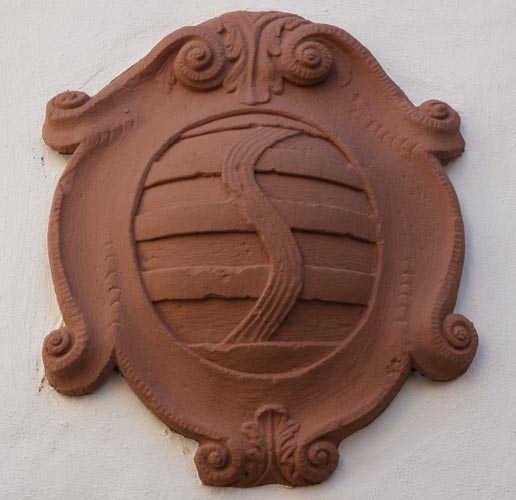Auf der Nordseite ist eine Kartusche mit dem Stadtwappen von Lohr angebracht, das etwas von der heute geführten Form abweicht. In seiner gegenwärtigen Form ist das Stadtwappen neunmal rot-golden geteilt und überdeckt von einem blauen Schrägwellenbalken. Die Basis des Wappens ist dasjenige der Grafen von Rieneck, die seit 1296 hier belegt sind und den Ort zu ihrem Hauptsitz machten. Die Grafen besaßen Lohr bis zu ihrem Erlöschen im Jahr 1559, danach kam Lohr, das seit 1333 Stadtrechte besaß, an Kurmainz. Das Rieneck-Wappen wurde durch den Schrägwellenbalken ergänzt, den man als Symbol für den Lohrbach interpretiert. Das Bild ist durch Siegelabdrücke seit dem frühen 15. Jh. überliefert. Die Tinkturen Rot und Gold waren durch das Rieneck-Wappen vorgegeben, die Tinktur des Wellenschrägbalkens war Änderungen unterworfen, mal war er grün, mal blau. Die Festlegung auf eine blaue Farbe erfolgte durch Ministerialentschließung vom 4.6.1957.