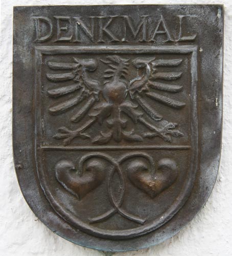 Über dem Westportal ist ein auf 1483 datierter Wappenstein eingemauert. Aufgrund des Datums gehört er zu Johann I. Graf von Rietberg (-16.2.1516), der 1472-1516 regierender Graf von Rietberg war und unter dem die abgebrannte Kirche wiederaufgebaut wurde. Er war der Sohn von Konrad V. Graf von Rietberg (-31.10.1472) und Jakobäa von Neuenahr (-23.2.1492). Er selbst hatte Margareta zur Lippe geheiratet, mit der er neun Kinder zeugte. Sein Wappenschild zeigt in Rot einen goldenen Adler. Die hier nicht dargestellte Helmzier wäre zu rot-goldenen Decken ein goldener Adlerrumpf zwischen zwei roten Flügeln. Es ist noch das alleinige Rietberger Stammwappen, denn die zu einer Wappenvermehrung führende Schlüsselehe fand erst durch Johanns Sohn statt, denn erst Otto III. Graf von Rietberg (-18.12.1535) hatte in zweiter Ehe Onna (= Anna) Omken von Esens geheiratet, die Tochter des ostfriesischen Häuptlings Hero Omken, und erst durch diese Heirat entstanden Ansprüche auf das Harlingerland, welches Onna fünf Jahre nach ihres Mannes Tod von ihrem Bruder Balthasar erbte. Dieser Wappenstein zeigt also eines der ursprünglichsten Wappen der Grafschaft und ist eines der wenigen heraldischen Zeugnisse der allerersten Grafenfamilie aus dem Haus Werl-Arnsberg-Cuyk in der Stadt.