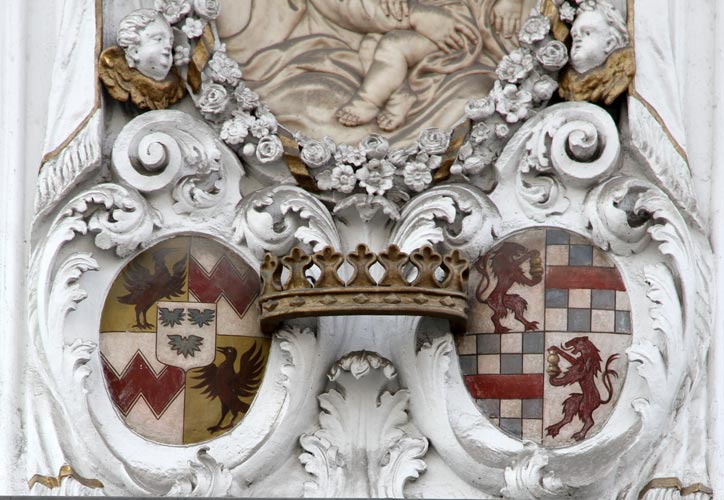 Wappen finden wir an dem Gebäude in der Mittelachse oberhalb des von schlichten Pilastern gerahmten Korbbogenportals, unterhalb eines barocken Madonnenreliefs aus gelblichem Marmor. Das Ehewappen, dessen beide Kartuschen durch eine vollplastische Krone miteinander verbunden werden, paßt zu Leopold Trapp Graf von Matsch (1764-20.11.1797) und seiner Frau, Maria Crescentia von Spaur-Burgstall (7.8.1769-). Die Stuckrahmung ist plastisch, die heraldischen Inhalte sind aufgemalt. Die Grafen Trapp kamen erst spät (in der Literatur wird 1804 angegeben, wozu aber das allgemein angegebenen Todesjahr 1793 der Gräfin Crescentia nicht paßt) durch Kauf an das Gebäude, für das zuvor drei Grundstücke und Häuser, darunter die sog. "Wolkenburg" (Ansitz Wolkenstein), besitzmäßig vereint und architektonisch zusammengeführt werden mußten, bis ein Palais dieser Größenordnung und vor allem dieser Breite baulich möglich war. Die bauliche Vereinheitlichung der Fassade fand um 1700 durch den Barockbaumeister Johann Martin Gumpp d. Ä. statt, das Wappen ist späteren Datums und ist in die Zeit der Gräfin Crescentia einzuordnen, die das Anwesen erworben hatte. Vor dem Verkauf an die Grafen Trapp gehörte das Gebäude den Grafen Künigl, und zwischen beiden Familien gibt es Heiratsverbindungen.