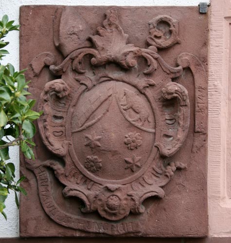 Der Wappenstein ist sekundär über dem Sockel links neben der Tür in die Außenwand eingelassen. Von dem die Kartusche umgebenden Inschriftenband lassen sich noch einzelne Abschnitte lesen: "(REVERENDUS DOMINUS) HERMANNUS HUNGRICH(HAUSEN ABBAS EBERBACENSIS) 1744". Abt Hermann Hungrichhausen (Hungrighausen) stammte aus Mengerskirchen bei Limburg, war seit 1703 im Kloster Eberbach und von 1737 bis zu seinem Tod am 9.9.1750 der 56. Abt des Klosters.