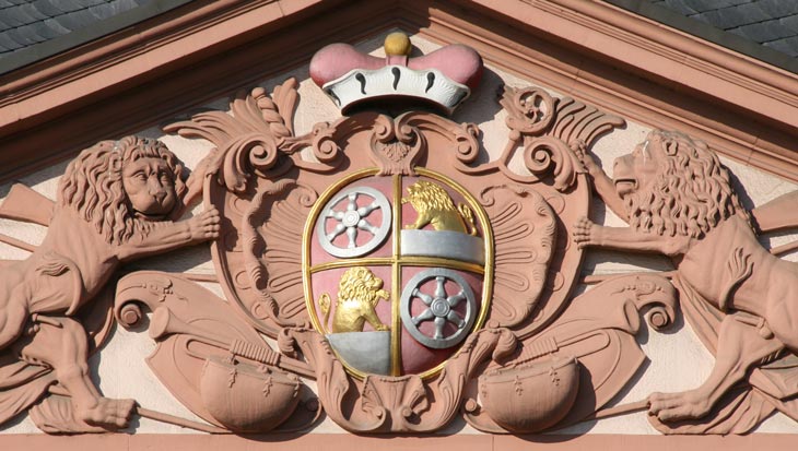 Im Dreiecksgiebel ist das Wappen des Mainzer Kurfürsten Philipp Karl von Eltz (reg. 1732-1743) zu sehen. Er stammte aus der Linie von Eltz zu Kempenich und führte den goldenen Löwen. Das Wappen ist geviert, Feld 1 und 4: in Rot ein silbernes, sechsspeichiges Rad für das Erzstift Mainz, Feld 2 und 3: geteilt, oben in Rot ein aus der Teilung wachsender goldener Löwe, unten silbern, das Stammwappen der von Eltz. Als Oberwappen findet man stets den Kurhut auf der Kartusche und das gestürzte Schwert sowie den Krummstab hinter der Kartusche schräggekreuzt. Als Schildhalter dienen hier zwei Löwen. Die Dekoration ist militärisch geprägt: Kesselpauken, Posaunen und Fahnen füllen den Freiraum des Giebels.