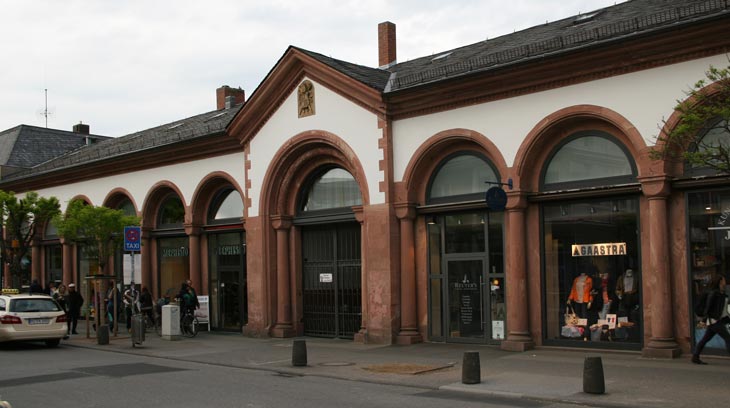 In der Schöfferstraße 6 steht ein 1832-1833 nach Plänen von Georg Moller errichtetes Arkadengebäude. Der Architekt war hessisch-darmstädtischer Oberbaurat und eher ein Vertreter des Klassizismus; nur wenige seiner Bauten orientieren sich wie dieser an mittelalterlichen Vorbildern. Die in Formen der Neoromanik gestaltete Halle mit aufwendig gestalteter Pfeilerbogenwand zur Straße hin war als Kaufhaus errichtet worden, und je zwei Arkaden waren pro Ladenlokal vorgesehen. Die Kämpferlinie kaschiert eine Zwischendecke, über der halbgeschossige Lagerräume vorgesehen waren. Romanisierend sind insbesondere die Vollsäulen aus rotem Sandstein mit den Korbkapitellen. Die mittlere Einheit mit der Tordurchfahrt ist baulich hervorgehoben. Sie springt leicht vor wie ein Risalit, besitzt einen dreieckigen Giebel, der das Traufgesims seiner Form folgen läßt, und der hier größer dimensionierte Bogen hat eine mit vegetabilen Formen ornamentierte Archivolte. Dieser Bau gilt als der früheste Handelsbau in neoromanischen Formen und ist ein Meilenstein der Entwicklung historistischer Architektur im 19. Jh.