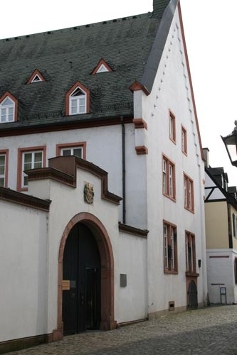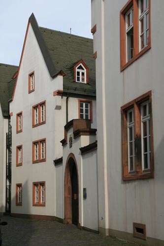 In der Kappelhofgasse 8 lag der mittelalterliche Hof "Zum Homberg". Im Jahre 1665 richtete Kurfürst Johann Philipp von Schönborn ein Waisenhaus ein, das erste seiner Art im Kurstaat. Zuvor hatte Dompropst Johann von Heppenheim gen. vom Saal den Hof zum Homberg gekauft und ihn seinem Landesherrn mit entsprechender Zweckbestimmung übereignet, welcher die Stiftung bestätigte und Mittel zum Unterhalt bereitstellte. Das im Kern mittelalterliche, anläßlich der Stiftung entsprechend umgebaute Anwesen besteht aus zwei parallelen, mit dem Giebel zur Kappelhofgasse ausgerichteten Bauten, zwischen denen eine hohe Mauer mit Tor die Verbindung herstellte. Der westliche Giebelbau (im linken Photo) besitzt hofseitig einen polygonalen Treppenturm aus der zweiten Hälfte des 16. Jh., der aus Backstein gemauert und mit Sandsteingewänden verziert ist. Bis 1922 diente der Bau als Waisenhaus. Im Zweiten Weltkrieg wurde der Hof zerstört. Das Anwesen blieb lange Ruine, bis sich 1977 die Kolpingfamilie für das Grundstück interessierte. Beim Wiederaufbau 1982-1985 wurde das alte Aussehen im nördlichen Bereich zur Straße hin nach Abriß rekonstruiert, während der südliche Bereich völlig modern als Kolpinghaus gebaut wurde. Nur der Treppenturm und die Außenmauern des Westflügels sind noch originale Bausubstanz und wurden nicht beim Umbau niedergelegt. Der Ostflügel hingegen war total zerstört und ist nach Abriß der Reste vollständig neu entstanden. Im Südosten der Baugrube wurden römische Lastkähne gefunden, die sich heute im Museum für antike Schiffahrt befinden.
