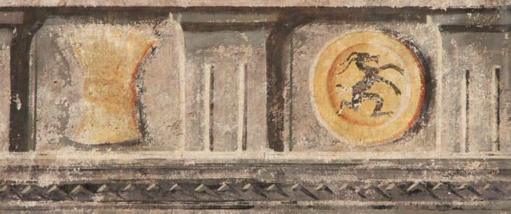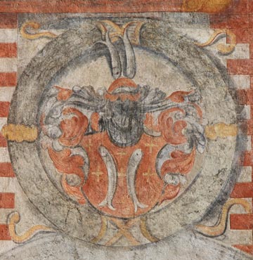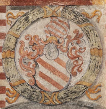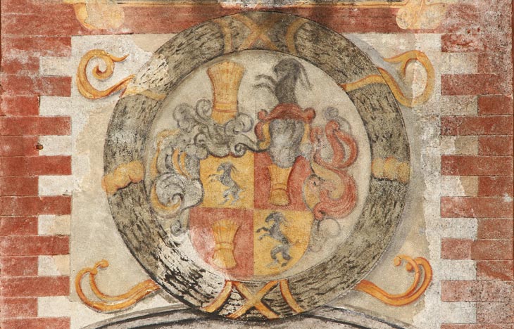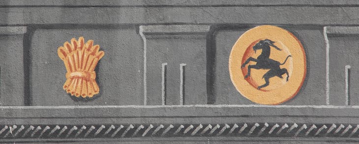 Die Wappenmotive der Hoffmann von Grünbühel und Strechau, die goldene Getreidegarbe und der schwarze Steinbock, letzterer aus Kontrastgründen jeweils einem goldfarbenen Medaillon aufgelegt, wiederholen sich auf dem gemalten Architekturfries, der unter den Fenstern des ersten Obergeschosses um das ganze Haus läuft. Oben ein gealterter, unten ein frisch renovierter Abschnitt des Frieses.