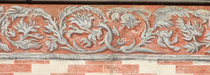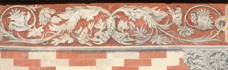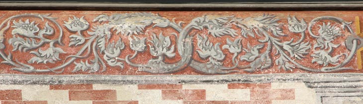 Das Gebäude wird oben unter der Dachkante von einem aufwendig gemalten Schmuckfries abgeschlossen, von dem hier drei Ausschnitte gezeigt werden. Die aus der zweiten Hälfte des 16. Jh. stammende Fassadengestaltung geriet im Laufe der Zeit außerhalb der Wahrnehmung. Erst als man 1956 das Haus restaurierte, kamen die alten Motive wieder zum Vorschein. Ab 1958 legte man sie frei, und ab 1963 ergänzte man die Dekorationen entlang der Längsseite des Hauses.