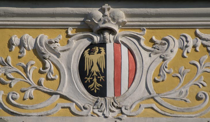 Die Schaufassade wird nach oben durch eine Attika abgeschlossen, die die wahre Dachstruktur dahinter kaschiert. Die Attika wird von vier aufgesetzten Steinvasen bekrönt (zwei weitere um die Ecke), unter denen jeweils ein Wappen eines österreichischen Bundeslandes inmitten einer üppigen Ornamentik dargestellt wird. Die beiden äußeren Wappen (Niederösterreich und Steiermark) bilden den Abschluß der Dekoration; die beiden inneren (Oberösterreich und Salzburg) werden von je zwei Adlerdarstellungen flankiert. Um die Ecke sind an der Seite noch Kärnten, Tirol und Vorarlberg abgebildet; das Burgenland (seit 1921) und Wien (seit 1920 eigenständiges Bundesland) fehlen. Deshalb entstand die Bemalung in dieser Form vermutlich ca. 1918/19.