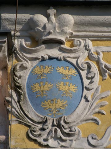 Das wichtigste Wappen befindet sich über dem Schmuckportal, welches vom Linzer Steinmetz Johann Michael Herstorfer gehauen wurde, von jenem durch das dem flachen Giebel direkt aufsitzenden Fenster des ersten Obergeschosses getrennt. Die vasenartigen Aufsätze der seitlich das Portal begrenzenden Wandvorlagen reichen bis ins erste Obergeschoß hinein. Besagtes Fenster besitzt einen getreppten, mittig nach oben ausgebogenen Giebel, der ein von zwei geflügelten Putten flankiertes Wappen der Stadt Wels einrahmt. Die Architektur verbindet so Portal, Fenster und heraldische Inhalte zur einem harmonischen Gesamtwerk. Der reiche Stuck der Fassade wurde vom Welser Stukkateur Michael Scherrhauf angefertigt. Er hatte auch die Innenräume stuckiert, die Decken wurden aber 1894 bei einer notwendig gewordenen Generalsanierung des Baus bis auf eine einzige im ersten Obergeschoß zerstört, ebenso die einst dort vorhandenen Fresken des oberösterreichischen Barockmalers Wolfgang Andreas Heindl. Die hölzerne Eingangstür selbst ist neobarock und stammt vom Ende des 19. Jh.