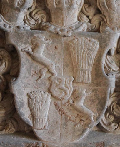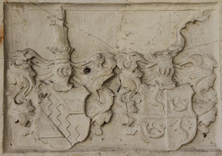 Das zweite Wappen auf der optisch rechten Seite gehört zu Adams erster Ehefrau, Elisabeth von Salm (1520-18.3.1557). Sie war die Tochter von Nikolaus Graf von Salm-Neuburg (1458-4.5.1530) und Elisabeth von Rogendorf. Elisabeth von Salm heiratete in erster Ehe Christoph Graf von Sankt Georgen und Bösing. Nachdem sie 1543 zur Witwe wurde, heiratete sie erneut, diesmal Adam Hoffmann. Ihr Wappen zeigt in rotem, mit goldenen Kreuzchen bestreutem Feld zwei silberne, aufrechte, gebogene und voneinander abgekehrte Salme, auf dem Helm mit rot-silbernen Decken auf einem Turnierhut zwei gestürzte, silberne Salme.