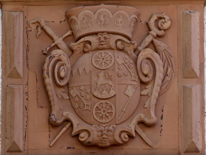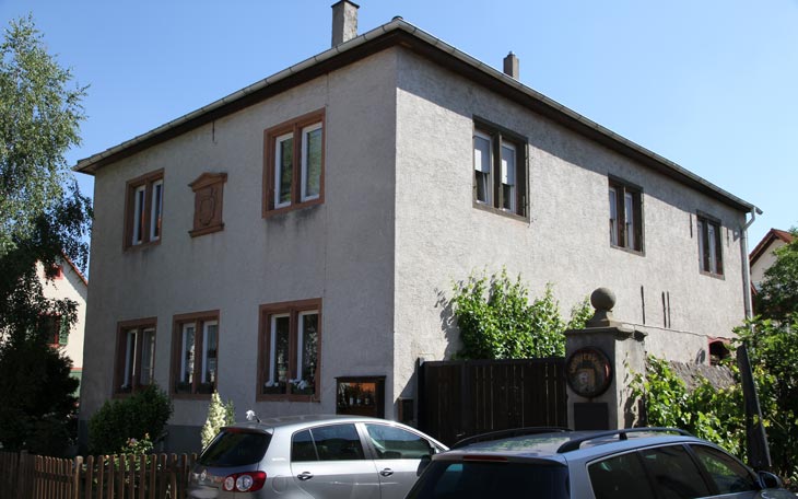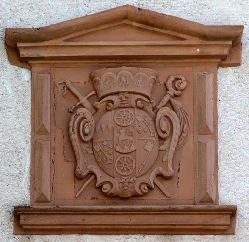 An der dreiachsigen Frontseite des zweistöckigen Verwalterhauses befindet sich in der Mitte des Obergeschosses der Wappenstein des Mainzer Kurfürsten Reichsfreiherr Johann Philipp von Schönborn. Er war in drei Bistümern bzw. Hochstiften Fürstbischof, in Würzburg ab 1642, in Mainz ab 1647 und in Worms ab 1663. Dieses Wappen stammt also aus der Zeit zwischen 1663 und seinem Tod 1673, denn wir sehen alle drei Fürstbistümer vertreten. Die Spolie wurde später mit einer neuen Einrahmung versehen.