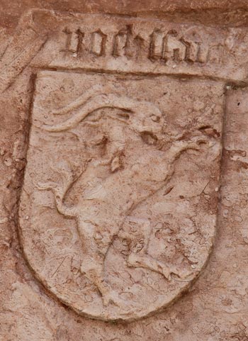 Das optisch linke Wappen ist das der Familie Wisent, es zeigt eine mit einem aufgerichteten, gestielten Lindenblatt belegte Spitze, auf dem ungekrönten Helm einen Flug, jeder Flügel mit dem Schildbild belegt. Das optisch rechte Wappen ist vermutlich dasjenige der Familie Huß, geteilt mit einem aus einem Berg wachsenden Steinbock, auf dem ungekrönten Helm drei Straußenfedern. Beide Wappen ohne Literaturbeleg, Hinweise willkommen.