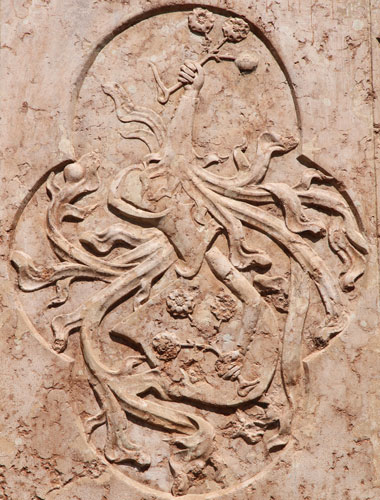 Laut Inschrift handelt es sich bei dieser Platte, die rechts des Kircheneingangs seitlich der Treppe angebracht ist, um das Wappen Pleystainer (Pleysteiner): "Der Ed(e)l hans pleystainer alhie Begrabe(n) ist gestorb(e)n im 1520 ia(h)re am 16 tag des hornung dem got(t) genad Amen". Das hier gewendet dargestellte Wappen für den am 16.2.1520 verstorbenen Hans Pleystainer, das nicht in den einschlägigen Sammlungen verzeichnet ist, zeigt im Schild einen Löwen, auf dem bewulsteten Helm eine wachsende Jungfrau mit einem geflochtenen Kranz im lang herabfallenden Haar, aus dem Kranz fünf Rosen hervorkommend, in der Rechten einen Rosenzweig haltend, die Linke an den Wulst fassend. Ausführung und Detailreichtum (vgl. z. B. die plastische Helmdecke und die Putten im oberen Bereich) machen diese Platte zu einer künstlerisch herausragenden Arbeit. Angaben zu Tinkturen und Literaturnachweisen willkommen.