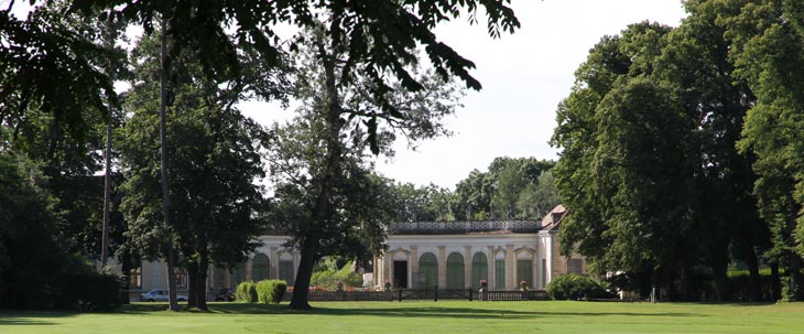 Genau genommen wird der Raum sogar zweimal verengt, weil die Viertelkreisflügel nach hinten versetzt angebaut sind, so daß sich hintereinander eine kleine und dann eine große Verengung ergeben. Gleichzeitig findet eine qualitative Staffelung der Architektur statt, denn diese gebogenen Orangerieflügel schließen im Gegensatz zu den vorgenannten Gebäuden flach ab und werden oben von einer steinernen Balustrade mit Figurenschmuck gesäumt. Dahinter liegt der rundum von weiteren Trakten und Nebengebäuden der ehemaligen Meierei umschlossene Hof, dessen Südostseite jedoch eine Lücke besitzt, die etwas breiter als der Durchlaß zwischen den Viertelkreisflügeln ist, so daß man vom Schloß aus die Existenz dieser Gebäudegruppe gar nicht wahrnimmt, sondern den Blick durch die Orangerielücke hindurch in die freie Landschaft laufen lassen kann, um den Übergang von der kultivierten Parklandschaft in die unkultivierte Natur bis in die Unendlichkeit erleben zu können. Hinter der Orangerie stieg einst eine riesige Fontäne als weithin sichtbarer Abschluß des Parks empor; diese ist jedoch nicht mehr vorhanden, genausowenig wie die Springbrunnen und Kaskaden vor der Gartenfassade des Schlosses. Statt dessen ist hier ein Rasenoval. Auch dieser Abschluß des Parks ist eine großartige Inszenierung unter Verwendung der Baugruppen als sich in den Blick des Betrachters schiebende Theaterkulissen, wobei der sorgfältig geplante Effekt ganz natürlich wirken soll.