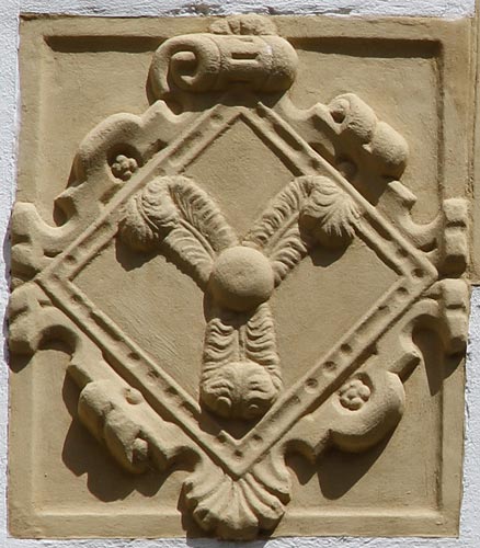 Zurück zum Wappenensemble auf der Außenseite: Die beiden Wappensteine für die zwei ersten Ehefrauen von Seyfried Christoph Graf von Breuner flankieren den Stein des Ortsherrn zu beiden Seiten und sind etwas nach unten verschoben, so daß die drei Steine 1:2 stehen. Die beiden seitlichen Wappen haben die für Frauen fakultativ verwendete Rautenform, die von einer üppigen Randgestaltung im Stil der Renaissance umrahmt wird. Dabei sind die beiden Rahmen in der Gestaltung verschieden, einmal ist das Muschelornament oben, einmal unten, und auch die umgeschlagenen Ränder sind im Detail individuell.