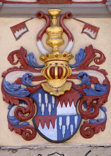 Noch eine Anmerkung zum Schenkenbecher im Wappen: Hier ist er nur in der Helmzier vertreten. Es gibt aber auch die Form mit einem zweiten Schenkenbecher, der zusätzlich dem Schild mittig aufgelegt wird: Ein solches, auf 1626 datiertes Wappen ist an der Decke der nahen Pfarrkirche von Markt Einersheim zu sehen (ohne Abb.) für die Brüder Wilhelm (10.6.1568-14.2.1633), Konrad (4.9.1570-10.10.1634), Heinrich (22.1.1573-13.5.1637) und Erasmus (11.8.1576-1653) Herren zu Limpurg aus der Obersontheimer Linie sowie für ihren Halbbruder Georg (23.5.1564-1.1.1628). Alle waren die Söhne von Erasmus I. Schenk von Limpurg-Obersontheim (14.1.1502-25.2.1553). Der einzige Bruder jedoch, der Speckfeld dann 1581 von seinem Cousin übernahm, war der nicht an der Kirchendecke genannte Friedrich VI. Schenk von Limpurg-Obersontheim (6.8.1536-29.1.1596). Auch an der Kirchendecke ist das Stammwappen mit den Heerkolben stets an der höherrangigen Position zu finden, im Gegensatz zu den Wappenformen nach der Übernahme durch die Grafen von Rechteren.