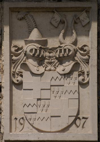 Das Wappen ist geviert, Feld 1 und 4: in Gold ein durchgehendes rotes Kreuz (Rechteren, Grafen von Rechteren-Almelo), Feld 2 und 3: erneut geviert, Feld a und d: in Rot eigentlich vier, hier fälschlicherweise nur drei aufsteigende silberne Spitzen, Feld b und c: in Blau 5 (3:2) aufrechte silberne Heerkolben (Schenken von Limpurg). Dazu werden zwei Helme geführt: Helm 1 (rechts): auf dem Helm mit rot-goldenen Decken ein goldener, rotgestulpter Hut, besteckt mit einer roten Straußenfeder (Rechteren, Grafen von Rechteren-Almelo), Helm 2 (links): auf dem Helm mit blau-silbernen Decken zwei rot-silbern im Spitzenschnitt geteilte Büffelhörner, in den Mundlöchern jeweils mit einem rot-silbern im Spitzenschnitt geteilten oder wie hier gespaltenen Fähnchen besteckt, wobei das auch hier vier Spitzen sein müßten, nicht drei (Schenken von Limpurg). Der Aufbau ist insofern korrekt, als der Wappenträger und Inhaber der Herrschaft im Jahre 1907, Friedrich Ludwig Graf zu Rechteren-Limpurg-Speckfeld (9.1.1811-23.4.1909), genealogisch dem Mannesstamm Rechteren entstammt und die Grafschaft Limpurg-Speckfeld nur erheiratet wurde.