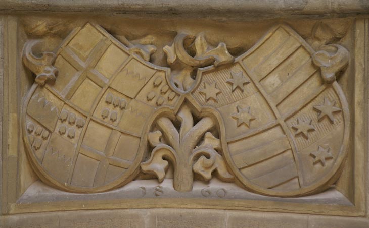 Über der in den baumbestandenen Innenhof des Schlosses führenden Tordurchfahrt befindet sich ein auf das Jahr 1860 datierter Wappenstein mit einem Allianzwappen aus zwei einander zugeneigten Schilden für Friedrich Ludwig Graf zu Rechteren-Limpurg-Speckfeld (9.1.1811-23.4.1909) und seine Frau, Luitgarde Louise Charlotte Sophie Gräfin zu Erbach-Fürstenau (13.5.1817-10.4.1897). Der heraldisch rechte Schild ist geviert, Feld 1 und 4: in Gold ein durchgehendes rotes Kreuz (Rechteren, Grafen von Rechteren-Almelo), Feld 2 und 3: erneut geviert, Feld a und d: in Rot vier aufsteigende silberne Spitzen, Feld b und c: in Blau 5 (3:2) aufrechte silberne Heerkolben (Schenken von Limpurg). Der Aufbau ist insofern korrekt, als der Wappenträger genealogisch dem Mannesstamm Rechteren entstammt und die Grafschaft Limpurg-Speckfeld erheiratet wurde. Der heraldisch linke Schild ist ebenfalls geviert, Feld 1 und 4: rot-silbern geteilt mit drei (2:1) sechsstrahligen Sternen in verwechselten Farben (Grafen von Erbach), Feld 2 und 3: in Silber zwei rote Balken (Herrschaft Breuberg).