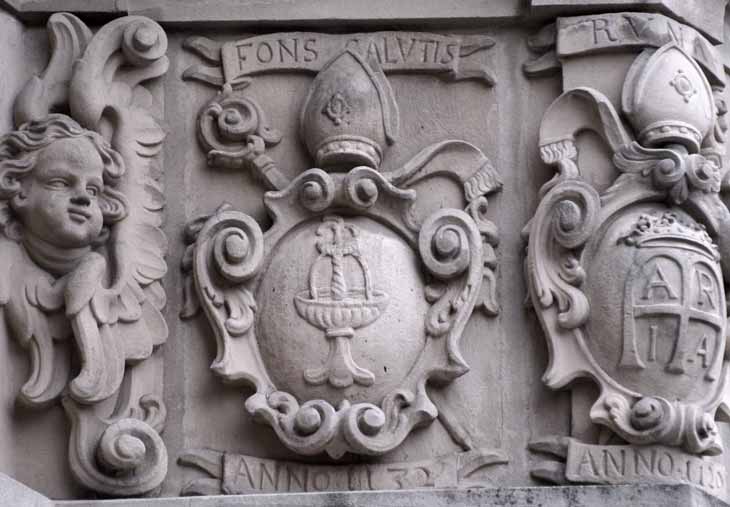 Auf der linken Seitenfläche der Brüstung des linken Erkers wird das Wappen betitelt mit "FONS SALVTIS ANNO 1132". Es handelt sich um das Kloster Heilsbronn bei Neuendettelsau in Mittelfranken zwischen Ansbach und Nürnberg, welches am von Bischof Otto I. von Bamberg 1132 auf von den Grafen von Abenberg gekauftem Territorium gegründet wurde, allerdings zunächst als Benediktinerkloster. Wenig später, im Jahr 1141, wurde es Ebracher Filialkloster und somit nur kurz nach der Gründung erneut, aber diesmal mit Zisterziensern aus Ebrach besiedelt. Die Neugründung lag an einer wirtschaftlich wichtigen Stelle, weil hier eine alte Straßenverbindung zwischen Nürnberg und Ansbach verlief und das Kloster fürstbischöfliche Besitzrechte in dieser Grenzzone sichern sollte. Die Grafen von Abensberg hatten die Klosterschutzherrlichkeit inne; ansonsten war Heilsbronn ein Eigenkloster des Bamberger Fürstbischofs und seit seiner Gründung von der Pflicht einer Vogtei befreit. Die Umwandlung des alten Ortsnamens "Haholdesbrunn" in das programmatische "Heilsbronn" entsprach üblicher Namensgebung des Ordens. 1581 wurde das Kloster Heilsbronn nach dem 1578 erfolgten Tod des letzten Abtes Melchior Wunder und dem langsamen Aussterben des Konvents aufgehoben. In der Kirche des Klosters hatten die Markgrafen von Brandenburg-Ansbach, die nach den Grafen von Abenberg die Schutzherrlichkeit innehatten und seit der Aufhebung das Klostervermögen verwalteten, von 1297 bis 1685 ihr Erbbegräbnis, und zahlreiche sehenswerte Epitaphien zeugen heute noch davon.