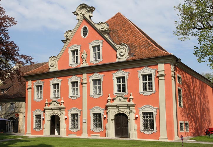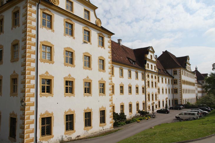 Wenn man den unteren Torbau durchschreitet, gelangt man in den Klosterhof, der rechterhand von einer langen Gebäudefolge gesäumt ist. Eines der ersten Gebäude auf der Nordseite der Anlage ist der ehemalige Marstall (Abb. oben). Die Gebäude rechts und links davon existieren nicht mehr, teils wurden die Werkstätten abgebrochen, teils sind sie abgebrannt wie der Gästestall links des Marstalls. Auch die rückwärtig angebauten Remisen wurden abgebrochen. Die geschlossene historische Bebauung wird erst mit der Pfisterei fortgesetzt. Der Marstall wurde wie der Torbau ebenfalls von Maurermeister Lorenz Rischer erbaut. Georg Bendele war für die Zimmerarbeiten zuständig. Auch hier fertigte Joseph Anton Feuchtmayer ursprüngliche Fassadenplastik an. Die Ausmalung im Innern oblag Johann Georg Brueder. Die Fassade wird durch zwei aufwendig gestaltete Portale und drei monumentale Wandvorlagen gegliedert, so als ob zwei Häuser nebeneinander stünden, aber der dreieckige Giebel ist mittig aufgesetzt und überspannt vier der insgesamt sechs Fensterachsen. Zwischen den beiden Giebelfenstern, quasi als Aufsatz auf der mittleren Wandvorlage, ist das Wappen des Abtes Konstantin Miller (Abb. unten), der das Gebäude 1734-1737 errichten ließ. Im links anschließenden Flügelbau, der im wesentlichen in den späten 20er Jahren des 8. Jh. umgestaltet wurde, hat sich noch Bausubstanz aus dem 16. Jh. erhalten.