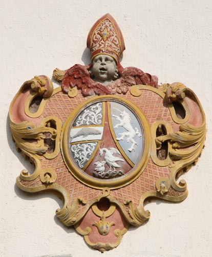 Über dem östlichen Portalbogen ist das Wappen des Salemer Abtes Stephan I. Jung angebracht, der 1698-1725 amtierte. Sein Wappen wird durch eine eingebogene Spitze in drei Felder aufgeteilt (Tinkturen nach der Äbtewappentafel), Feld 1: in Schwarz ein silberner, einwärts mit einem goldenen oder naturfarbenen Fisch belegter Balken (der schwarze Hintergrund ist im vorliegenden Fall üppig mit Ranken damasziert), Feld 2: in Blau ein aufspringendes silbernes Einhorn, Feld 3: in Rot ein silberner Pelikan mit Jungen auf seinem Nest.