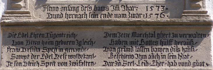 Der ältere, aufwendig im Stile der Renaissance verzierte Wappenstein befindet sich in der Mittelachse des Schlosses zwischen den Fenstern des ersten und denen des zweiten Obergeschosses. Die erste Inschrift ganz oben ist unleserlich und wurde bei der Renovierung deshalb auch nicht farblich abgesetzt nachgezogen. Die zweitobere Inschrift lautet: "Drumb Mensch zu erst baw ein, Da du gerrn wol(l)t(e)st Ewig sein." Die dritte Inschrift, unterhalb der Wappenzone, gibt die Eckdaten des Baues an: "Anno anfang dess baws im Jhar: 1573. Uund hernach sein ende na(h)m zwar: 1576." Die vierte, unterste Inschrift nennt die Bauherren, Mutter und Sohn: "Die Edel Ehren Tugentreich, von Uttenheim geboren(e) z(u)gleich, fraw Ursula Spettin genan(n)dt, Sampt der Edel Vest wo(h)lbekan(n)t(e), I(h)r so(h)n Ulrich Spett von Zwi(e)falten, Dem Jetzt Marchtal g(e)h(o)ert zu verwalten, Haben mit Gottes hülff(e) herauß, von grund lassen bawen di(e)ss hauß, Befehlens Ihm auch in sein huat, Dar zu Seel(e) Leib Eher hab uund guat."