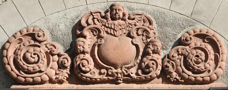 Der Südeingang ist noch üppiger geschmückt als der Westeingang, mit drei Köpfen und einer Maske rings um das Zentralfeld und zwei grotesken Köpfen an den Enden der seitlichen Schnecken, enthält aber weder Wappen noch Inschriften.