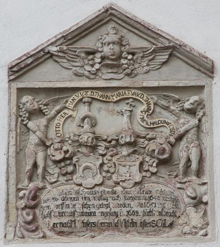 Der größere der beiden Wappensteine ist sehr aufwendig gestaltet. Im dreieckigen Giebelfeld ist ein geflügelter Engelskopf zu sehen. Das Rechteckfeld darunter enthält eine Wappenzone und eine Schriftzone. Die renovierungsbedürftige, aber noch lesbare Inschrift lautet: "Haben di(e)ß(es) Haus und alle neben Geb(a)eude welche in dem 30=Jährigen Krieg freytag nach Pfingsten (An)no 1640 samt gantzem Dorff in die Aschen gelegt Worden, A(nn)o 1651 mit Göttl(icher) hülff(e) wi(e)der auffzubauen angefang(en) u(nd) 1668 glückl(ich) vollbracht. Der nahM(e) Vnser(e)s herrn IesV Ist eIn Vestes sChLoß". Die letzte Zeile enthält ein Chronogramm, welches D + M + V + I + V + I + I + V + C + L = 500 + 1000 + 5 + 1 + 5 + 1 + 1 + 5 + 100 + 50 = die Jahreszahl 1668 ergibt. Der Hintergrund der Zerstörung im Dreißigjährigen Krieg ist, daß ein in Diensten der von der Tann stehender Jäger einen kaiserlichen Parlamentär abknallte. Die Rache war furchtbar: Das Schloß und der Großteil des Dorfes wurden gebrandschatzt. Ab 1651 konnte dann der Wiederaufbau erfolgen, der 1668 abgeschlossen war.