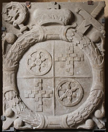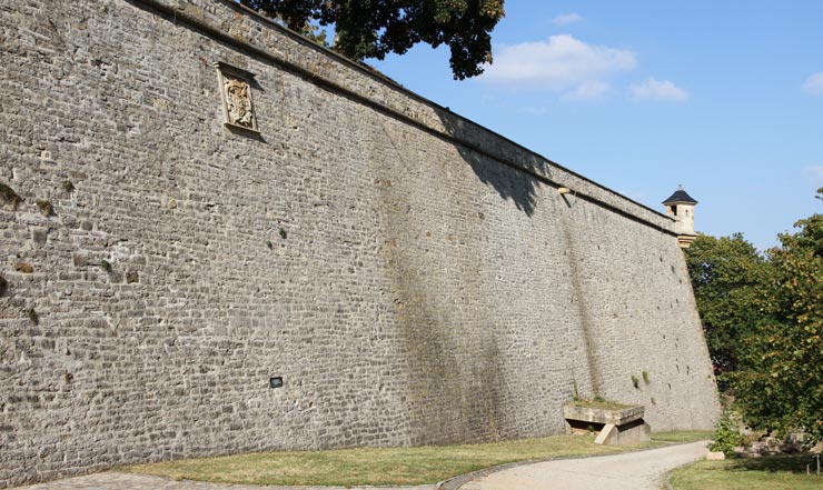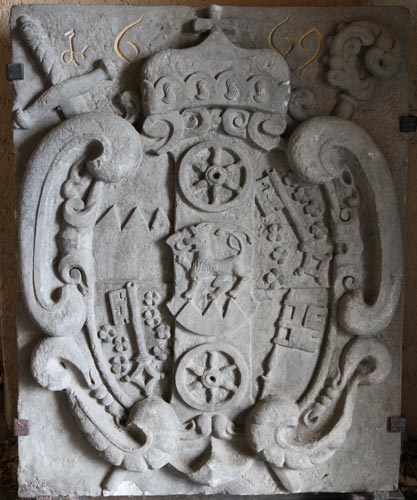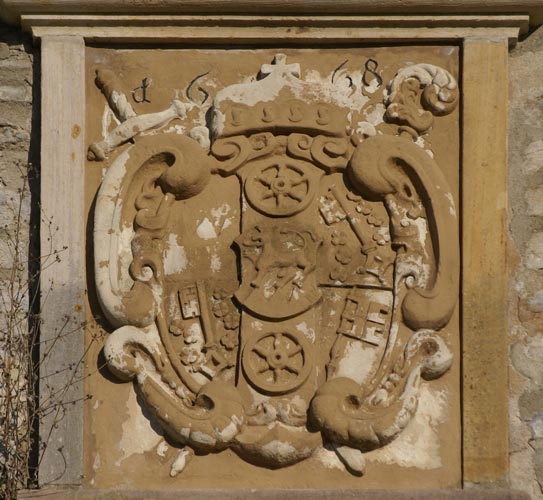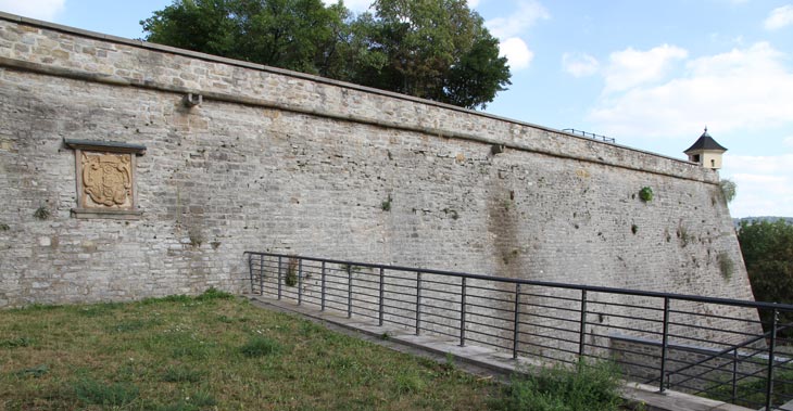 Das Wappen links an der Westflanke der Bastion Martin ist auf 1668 datiert und zeigt das Wappen des Mainzer Kurfürsten Johann Philipp von Schönborn wie beschrieben.